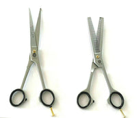 2pcs german curved barber hair trimming scissors + double teeth thinning shears is made using the finest 410-stainless steel which guarantees a long-lasting razor cutting edge.Has a thumb rest for your convenience (removable).Black finger rings are also removable.Perfect for barbershops, hair salons/hair stylist, and household use. Can also be used for pet grooming.What's included?-7.5? curved blade German barber hair cutting scissors.-6.5? double teeth thinning shears (38 teeth).-Each comes with a plastic case to hold/protect your shears/scissors.